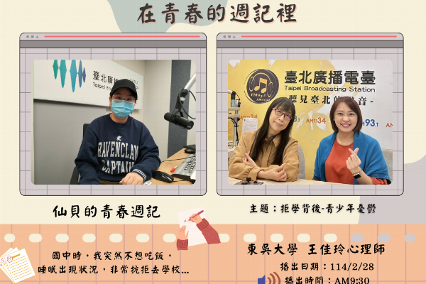 瑜珊,寫下15歲的週記故事,心情顏色是灰藍色的,因為她很努力,卻總覺得怎麼做都不夠好,她很害怕,讓大家失望,也很害怕,自己會被看穿。她甚至不知道,如果沒有了成績和成就,她還剩下什麼可以被大家喜歡。 瑜珊目前是一名大學生,就讀國立清華大學。瑜珊說,15歲時,感覺人生一片黑暗,有點憂鬱。因為她從小就被爸媽拿來跟其他人比較,活在被成績定義的框架裡。考不好會自我否定,認為自己不夠好。她也很容易把事情想得很糟糕,就算是自己擅長的事情,也沒有信心去完成。 國中會考的失敗,瑜珊才明白自己的壓力竟然這麼大。考試的時候會胃絞痛、偏頭痛,就是自律神經失調的狀態。某一天,輔導老師問瑜珊,還想不想繼續拚第一志願,她眼淚突然潰堤,大哭。除了成績以外,她感受到有人真的關心她的想法和心情,然後願意引導她慢慢把事情說出來,好像水龍頭開關被打開了。 她後來才發現哭是一種很好釋放情緒的方法,只是她很少哭。因為在同學眼中,瑜珊平常都笑笑的,而且被當成榜樣,成績不差、參加各項比賽、頒獎,所以如果表現出負面的情緒,形象會大打折扣,因此瑜珊都選擇忍著,放在心裡,然後自己慢慢去消化。 瑜珊在家裡也很少哭,因為如果哭,爸爸媽媽可能會說,才這麼一點小事,為什麼要哭? 因為考試的時候,瑜珊會緊張到胃痛、頭痛,很累很累的時候,瑜珊也會出現是不是離開就會好一點的念頭,後來瑜珊鼓起勇氣請媽媽帶她去看身心科,也有吃藥。瑜珊說,她感謝那個時候的自己的,因為爸媽不相信她身體已經出現問題,認為她不是那種有問題的小孩,所以她花了蠻久時間告訴爸媽,她身體不行了,請爸媽帶她去看醫生。 瑜珊想告訴自己,也想要對所有正在聽這個節目的大家說,你不需要先變成別人期待的樣子,才開始真的喜歡自己,因為每個人的存在本來就值得被溫柔的對待。 #用成績定義孩子的價值,對孩子的身心會造成哪些影響? #什麼是微笑憂鬱? 佳玲老師愛的提醒:你不需要一直證明自己,因為你可以持續被愛。 #瑜珊的青春週記 #東吳大學健康暨諮商中心王佳玲心理師 節目名稱:在青春的週記裡 播出時間:115年1月24日早上9:30 實體收聽:臺北廣播電台FM93.1 全新網路電臺:聽臺北T Radio 請立刻點擊、體驗「聽臺北」 👉 http://tradio.gov.taipei